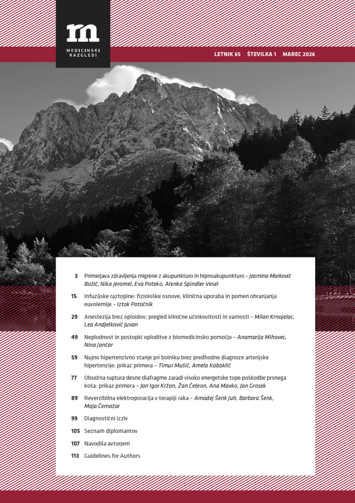 Šestletna deklica je decembra 2024 prišla v urgentno ambulanto zaradi vročine v zadnjih petihdneh, ki je kljub uporabi antipiretikov vztrajno naraščala. Poleg tega so starši poročali, da jevečino časa zelo utrujena in neješča. Navajajo tudi, da deklico obliva občasna vročica, ki jo spremljapospešeno dihanje. Starši so dan pred tem opazili tudi, da je deklici koža na mestu predhodnegaoperativnega posega pordela.Deklica je bila pred tremi tedni hospitalizirana zaradi vnetega slepiča. Načrtovana je bilalaparoskopska odstranitev slepiča, ampak je bila zaradi zapletov med operacijo izvedena odprtaoperacija. Pred operacijo je imela deklica vstavljen osrednji venski kateter v subklavijsko veno,po katerem je tudi po operaciji preventivno pet dni prejemala antibiotično terapijo. V bolnišnicije prejemala intravenozno ceftriakson in metronidazol, po odpustu je prešla na per os zdravljenjez Augmentinom® (amoksicilin in klavulanska kislina). Deklica je bila odpuščena pet dnipo operaciji, poleg antibiotikov je prejela tudi antiemetično in analgetično zdravljenje. V tednupred nastankom novih simptomov ni bilo prisotnega kašlja, bruhanja ali driske. V zadnjih šestihmesecih družina ni nikamor potovala in nihče v družini ni imel podobnih simptomov.Ob sprejemu v urgentno ambulanto je bila deklica neorientirana v času in prostoru ter jeodgovarjala upočasnjeno, vendar ustrezno. Njen krvni tlak je znašal 95/60mmHg, telesna temperaturaaksilarno 39,4 °C, frekvenca srca je bila…